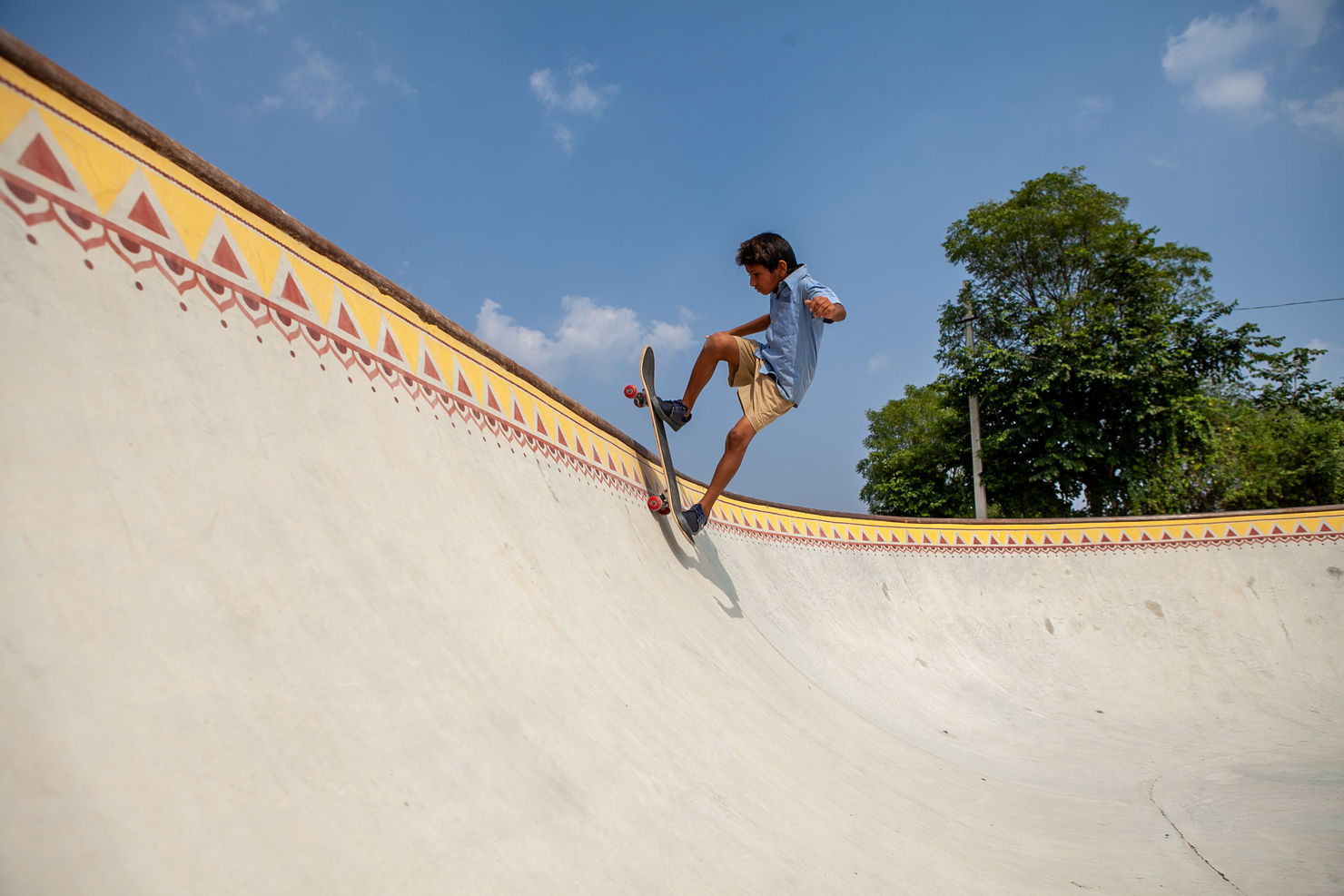 Situated on an one acre campus, the 14,500 sqft skatepark is one of India’s largest and Rajasthan’s first skatepark. The skatepark was built with the team from 100 Ramps with the help of Indian and International volunteers, and skateboarding and acting workshops began in October 2018.